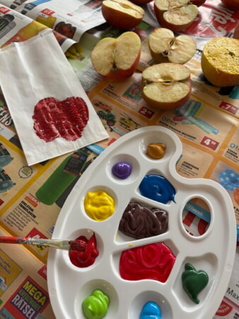 Mit halbierten Äpfeln als Stempel entstanden farbenfrohe Muster auf Papier und Tüten. Daneben rätselten die Kinder gemeinsam – Suchbilder sowie kleine Logikaufgaben zum Thema „Apfel“ förderten die Konzentration. Ein besonderes Highlight war das Basteln „leuchtender Äpfel“. Aus Papier und Transparentfolie entstanden dabei farbige Dekorationen, die die Kinder stolz präsentierten.