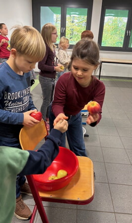 Zum Abschluss stand für die Kinder noch ein kleiner Spiel-Wettbewerb in Gruppen auf dem Plan. Der Apfeltransport auf dem Löffel sowie das Schätzen von Gewichten von Äpfeln stärkten das Zusammengehörigkeitsgefühl. Gegenseitiges Anfeuern und Hilfsbereitschaft prägten den Vormittag.