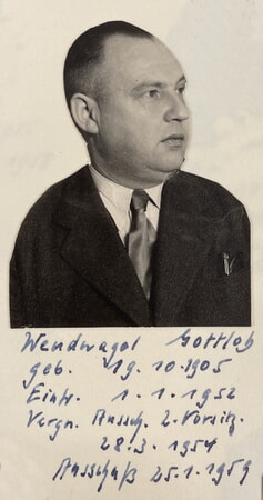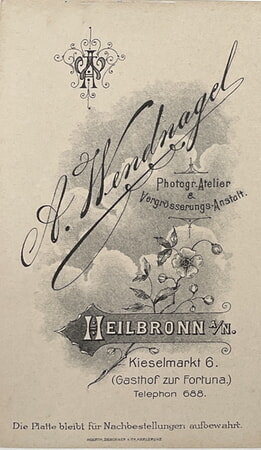 Alexander Wendnagel junior (* 15.11.1901; † 04.12.1944) besuchte 1924/25 die Münchner Fotoschule (damals Staatliche Höhere Fachschule für Phototechnik), wurde später aber städtischer Angestellter in Heilbronn. Sein jüngerer Bruder Gottlob Wendnagel (*19.10.1905; † 19.01.1989), Fotografenmeister, übernahm 1934 die Leitung des elterlichen Geschäftes. 1937 starb die Ehefrau Karoline geb. Lell von Alexander Wendnagel sen. Vier Jahre später heiratete dieser die Witwe Frida geb. Morlok verw. Müller aus Nordheim, die dort ein Haus in der Bahnhofstraße 60 besaß. Der Angriff auf Heilbronn am 4.12.1944 traf die Familie Wendnagel hart. Durch den Fliegerangriff starb Alexander Wendnagel jun. sowie seine Schwester Martha verh. Drück. Das Geschäftshaus am Marktplatz war völlig zerstört. Aufnahme fanden die ausgebombten Mitglieder der Heilbronner Wendnagel-Familie beim Vater Alexander sen. und dessen zweiter Ehegattin in deren Haus in Nordheim. Gottlob Wendnagel wohnte mit Frau und Tochter Gisela (+1937) sowie der nun elternlosen Nichte Christa (*1937), deren Mutter war bereits 1940 gestorben, bis November 1953 in Nordheim. Nach der Fertigstellung des Neubaus und dem Umzug nach Heilbronn in die Falkenstraße 1 (beim Rathaus) betrieb Wendnagel viele Jahre eine Filiale in Nordheim. Zunächst in der Bahnhofstraße 60 (Gebäude vor dem Gasthaus „Ochsen“), später in der Hauptstraße 91 Ecke Klimmerdinger Straße/Hauptstraße und schließlich bis zum 30. 9.1980 in der Bahnhofstraße 54 (nach der Gärtnerei Lell). Gottlob Wendnagel war seit 1952 aktives Mitglied im Liederkranz Nordheim, er sang im 1.Tenor und war Mitglied in verschiedenen Ausschüssen und ab 1954 zweiter Vorsitzender des Vereins. Im Vereinsalbum, das er selbst angelegt und gestaltet hat, befindet sich eine Fotomontage mit seinem Portrait.