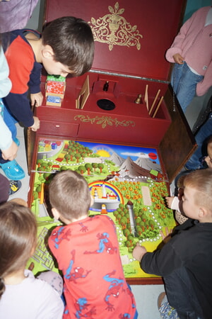 Am Montag, dem 10.11. war Frau Cicek von der Bücherei und die Theaterpädagogin Frau Mundt bei uns im Kindi. Sie kamen aber nicht einfach nur so. Nein, Frau Mundt hatte eine große Kiste dabei. Wir waren alle sofort neugierig und gespannt, was sie mit uns und der Kiste vorhatte. Wir durften nämlich unser eigenes Märchen erfinden und spielen. Aber bevor es losging, brauchten wir erst den Theater-Zauber-Duft und unsere Theater-Verkleidung.