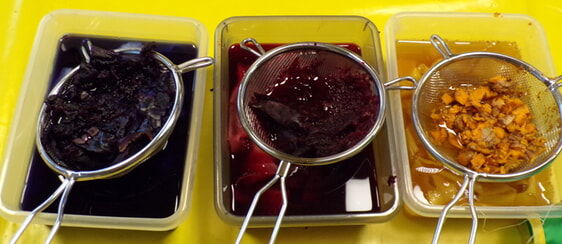 Rotkohl, Rote Bete und Kurkuma wurden zusammen mit Raspeln, Messern und Sieben bereitgestellt und die Kinder haben fleißig daran gearbeitet, die Farben herauszuholen. Mit etwas Wasser haben wir dann noch Stoffstreifen eingefärbt.