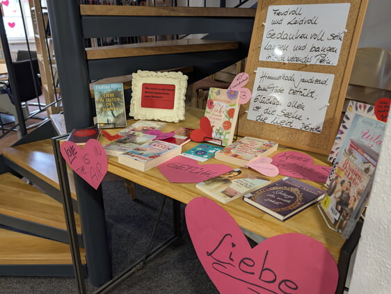 In den nächsten Tagen ist Valentinstag. Beim Seniorenmittagessen letzte Woche haben wir gefragt: "Was fällt euch ein, wenn ihr an den Valentinstag denkt?". Von den Mittagessensteilnehmern wurden ganz viele Herzen mit ihren Antworten beschriftet, die jetzt an den Fenstern der Ortsbücherei hängen. Inspiriert davon haben wir einen Büchertisch mit passender Lektüre für die Büchereibesucher vorbereitet. Ihnen fällt auch etwas ein, wenn Sie an den Valentinstag denken? Dann kommen Sie vorbei und beschriften auch eines der Herzen für unsere Fensterdeko.