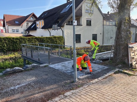 Im Jahr 2003 wurde für den Blumensommer eine Aussichtplattform am Katzentalbach errichtet. Der Steg wurde damals mit Holzbalken auf denen die Holzbohlen befestigt wurden aufgebaut. Die Witterung hat den Balken und dem Belag in den 23 Jahren so stark zugesetzt, dass der Aufbau nicht mehr verkehrssicher war. Der neue Aufbau mit den Stahlträgern und einem langlebigen Oberflächenbelag hat unser Team vom Bauhof durchgeführt. Die Aussichtsplattform kann jetzt wieder ohne Bedenken benutzt werden.