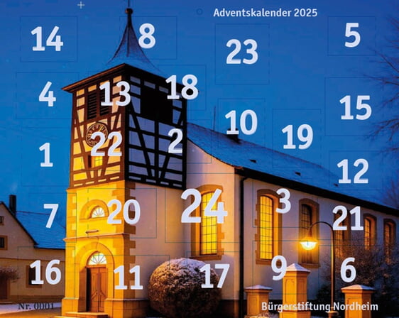 Nach den erfolgreichen Auflagen in den letzten Jahren gibt es auch in diesem Jahr den Nordheimer Adventskalender der Bürgerstiftung. Dank zahlreicher Sponsoren finden sich hinter jedem der 24 Türchen attraktive Gewinne im Gesamtwert von über 3.500 €. Große und kleine Preise, wie z. B. Waren-, Einkaufs-, Restaurant- und Veranstaltungsgutscheine warten auf glückliche Gewinner.